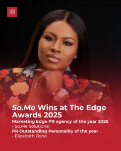SoMe Solutions, the powerhouse communications agency led by PR strategist Elizabeth Osho, has once again proven its leadership in storytelling and brand influence, earning the coveted title of “PR Agency of the Year 2025” at the Marketing Edge Awards. Elizabeth Osho was also honoured with the distinguished “Outstanding PR Personality of the Year” award, a dual recognition that celebrates her visionary leadership and the agency’s transformative impact on Africa’s communication landscape.